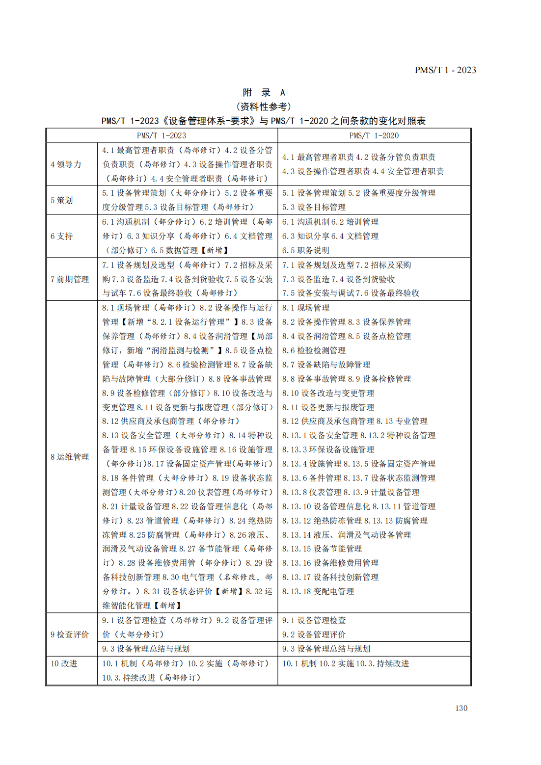 附錄A(資料性參考) PMS/T 1-2023《設備管理體系-要求》與PMS/T 1-2020之間條款的變化對照表