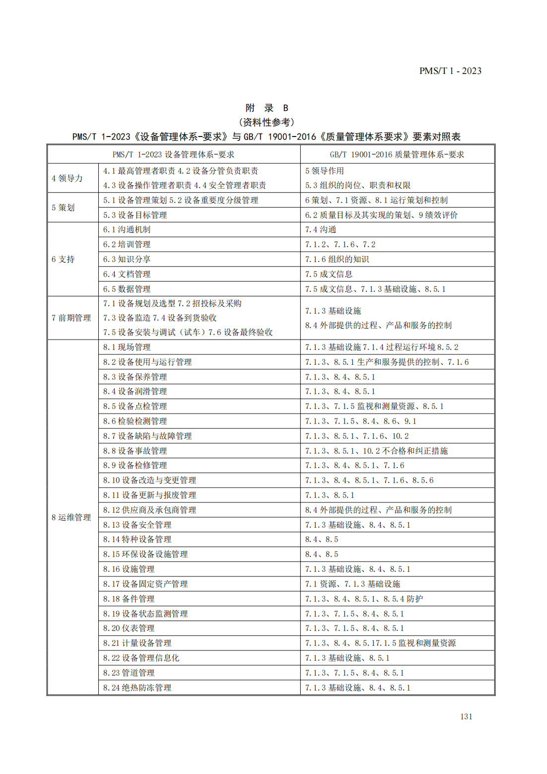 附錄B(資料性參考)PMS/T 1-2023《設備管理體系-要求》與GB/T 19001-2016《質量管理體系 要求》要素對照表