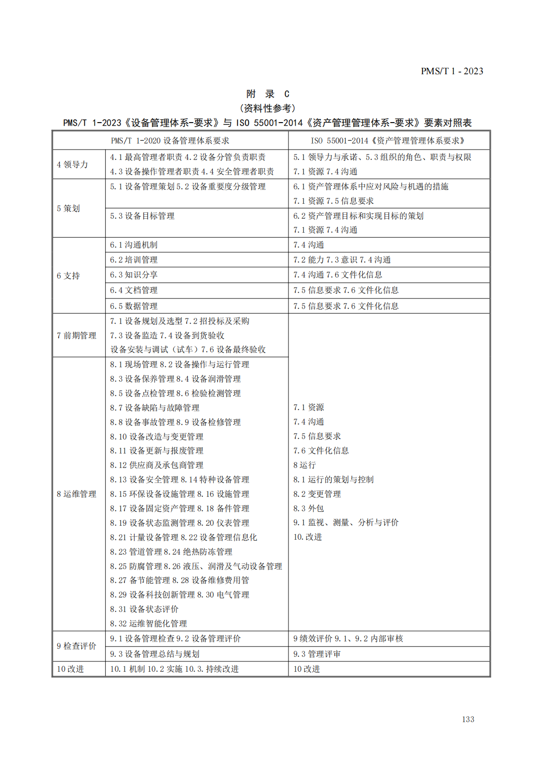 附錄C(資料性參考) PMS/T 1-2023《設備管理體系-要求》與ISO55001-2014《資產管理 管理體系-要求》要素對照表