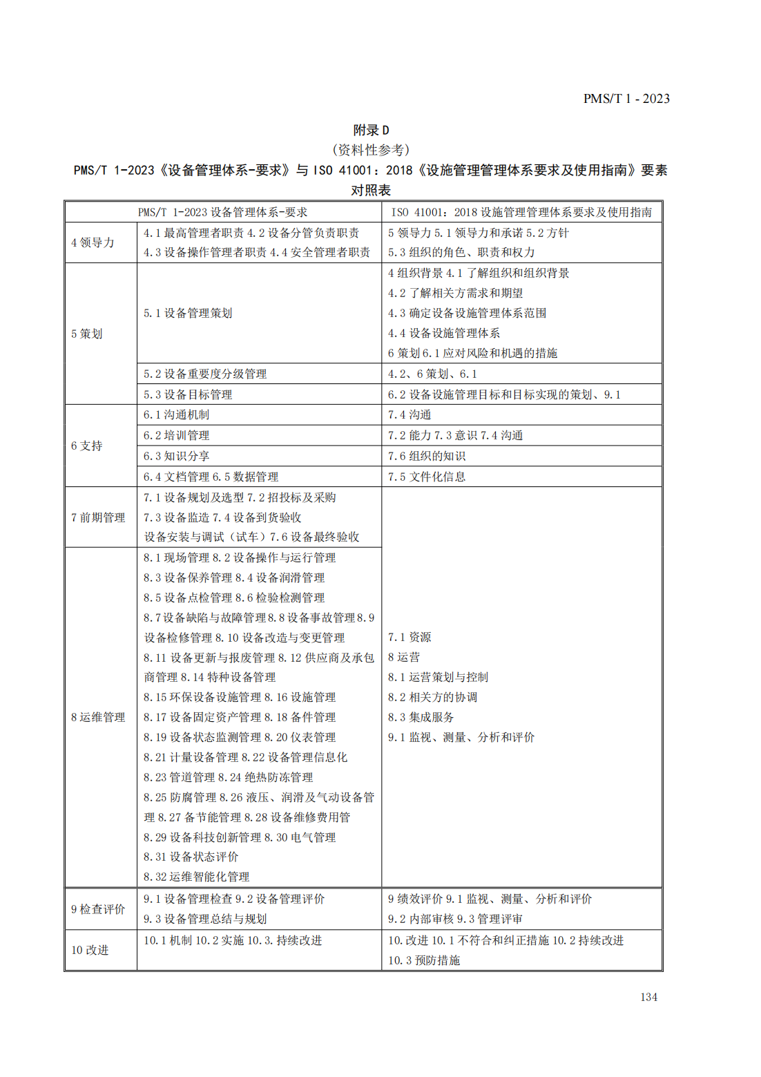 附錄D(資料性參考) PMS/T 1-2023《設備管理體系-要求》與ISO 41001:2018《設施管理 管理體系 要求及使用指南》要素對照表