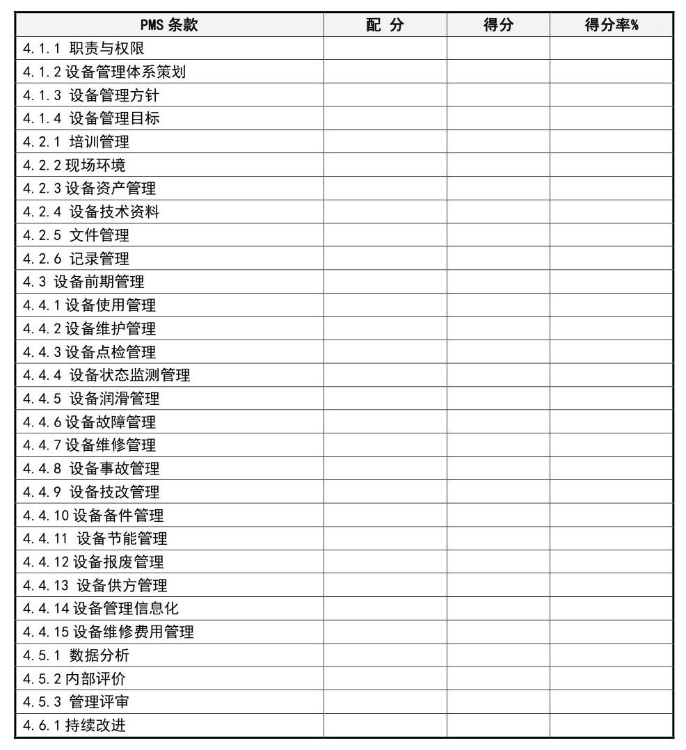 注:對設備管理體系有刪減條款的企業,可按等級占總分比等等級。例:某企業不適用設備采購條款,若此條款配20分,則應得分為1000-20=980分,若實際得分為600分,則(650÷980)×100=66%,評定結果為3星級。