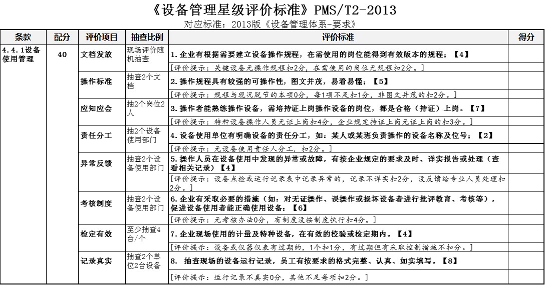 注:設備管理星級評價星級分為九個等級,等級越高表示企業設備綜合管理水平越高。星級等級劃分, 見PMSM-1《設備管理星級評價指南》。
