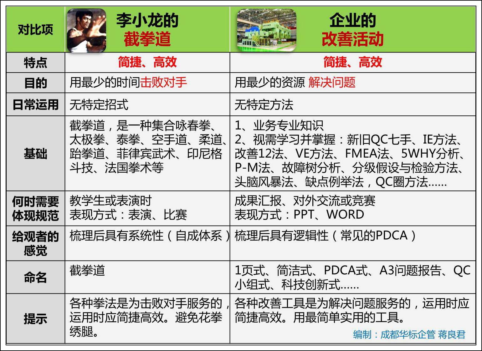 蔣良君提出對改善的新觀點(下圖):用簡潔有效的改善工具,對改善管理的效率提升及基層參與有幫助。