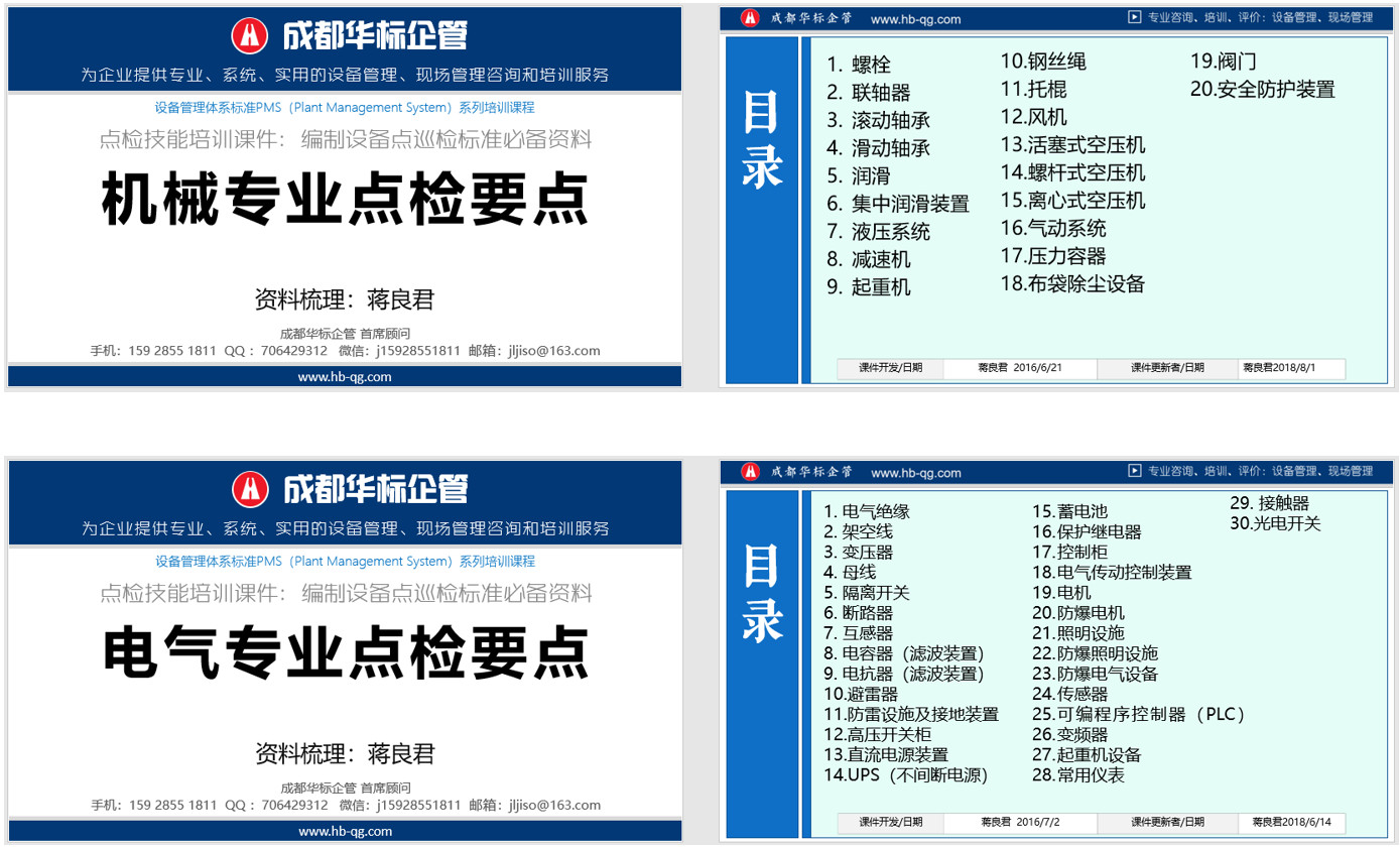 1.本點檢實用技能教材,由成都華標企管的專業咨詢顧問開發,將顧問從企業到專業咨詢的點檢實踐經驗與專業理論和適用的國家、行業技術標準進行總結與提煉,編制了比較適合企業設備專業人員及崗位操作人員用的點檢實用技能教材。