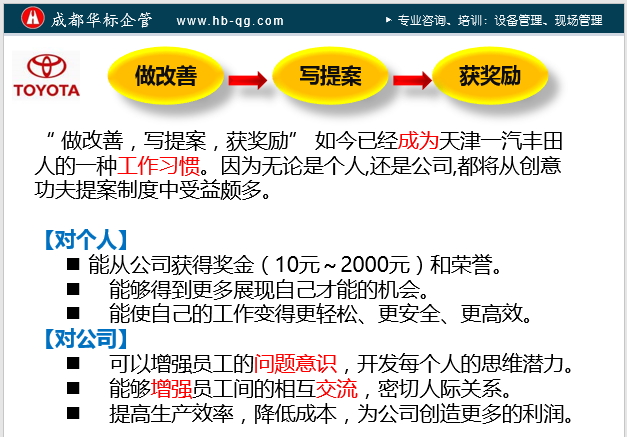 這個改善提案主要是從全員減少各種浪費開始。其活動的是做改善-寫提案-獲獎勵(如圖),是先做改善再提案,與我們的先提案再改善的順序是不同的。改善激勵的強度,與改善提案的價值成正比,且有助于激勵員工。