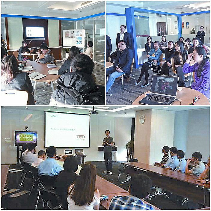 關于手機和平板電腦的移動辦公功能你知道多少?你的iPhone和iPad還有多少功能未被挖掘?“午間道”第二期,李喆用多媒體教學手段為同事們演示了如何應用各類數碼設備。課堂上,聽眾先用手機拍攝二維碼來關注微信賬號,再通過肢體感應操作電視機中自己的“影子”進行真人“水果忍者”游戲,隨后,一個演示視頻通過iPhone在投影儀上播放,配合演講……