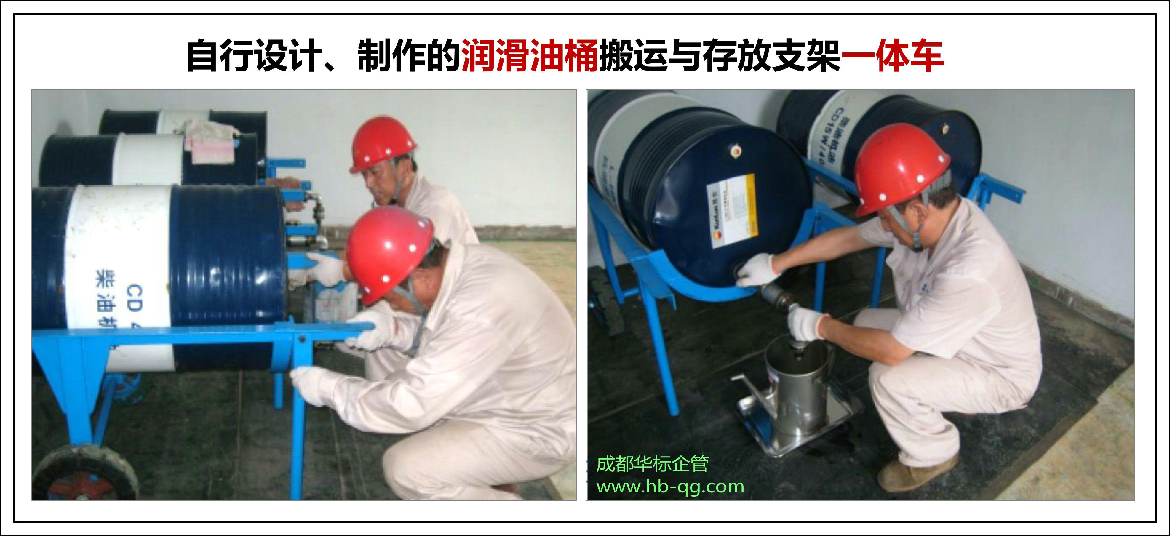 由鞍鋼集團礦業(yè)公司大連石灰石礦汽車隊自行設(shè)計、制作的潤滑油桶搬運與放置一體車,核心亮點是方便搬運與放置,此方法值得借鑒。 提示:1.在放油管口下面,還應(yīng)放置接油托盤,避免放油后管內(nèi)余油滴到地面。2.墻上還需貼藍底白字的油品牌號標示牌。