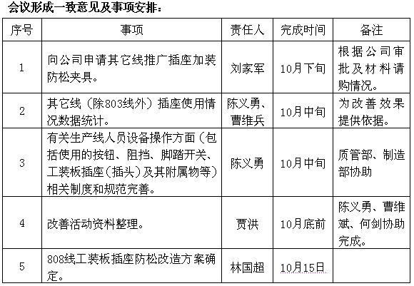 3、針對活動前期工作改善小組召開總結會議,對下一步活動的開展進行討論。要求對于統計數據匯總夾具沒有使用的,影視廠應予以要求,保證已安裝的夾具全部使用,充分發揮其給生產帶來的實際效果;對于少數已使用夾具而不帶電確認為工裝板插座疲勞損壞造成的,影視廠要安排對此及時予以更換。對于影視廠提出首批夾具在使用過程存在一些不足,要求廠家予以改進。