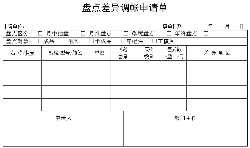 4、對各實物盤點差異的由各倉管填寫《盤點差異調帳申請單》進行申報,獲批準后才可進行更改臺帳和電腦帳。