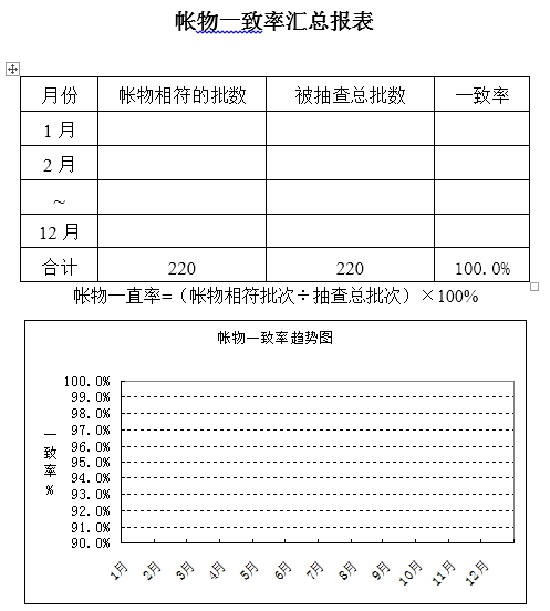 1、抽查時間規定在月底列印報表后,依報表數據隨機抽查3款實物數與帳面數,電腦數核對,其差異反映到《倉庫課帳物一致性抽查統計表》中。