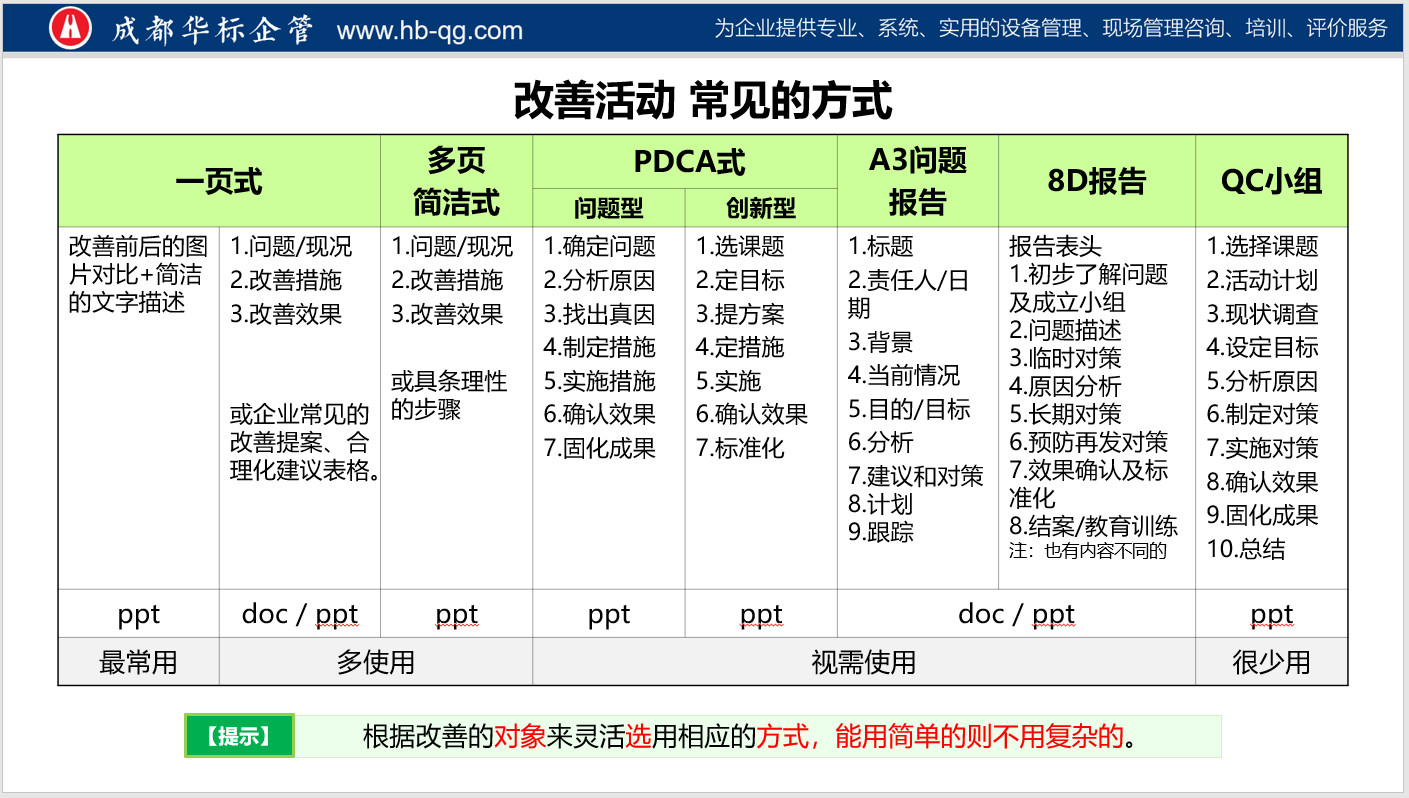 ▆關于改善結果資料的表現(見下圖)。建議能用一頁式的,則不用簡潔式,能用簡潔式的則不用PDCA式的,能用PDCA式的,則不用QC小組式的。要用簡潔適用的工具,作為改善活動的工具及結果材料的表現,避免將簡單的問題表現復雜化而浪費時間,這是近年來QC改善材料最典型的形式主義。