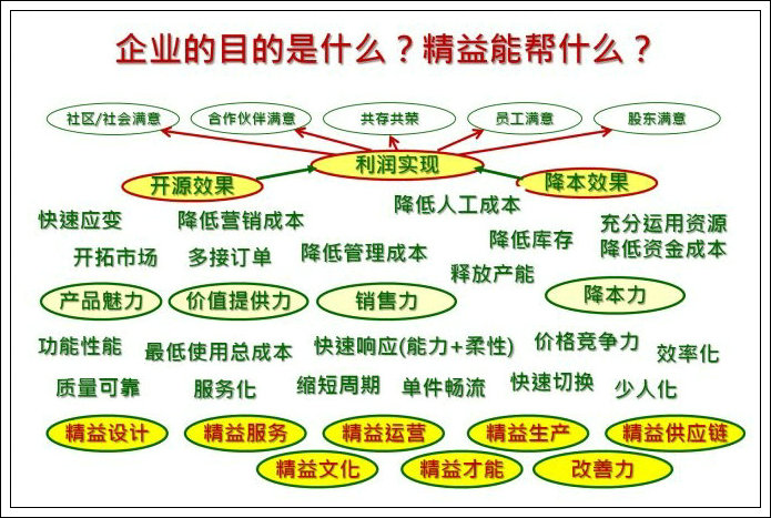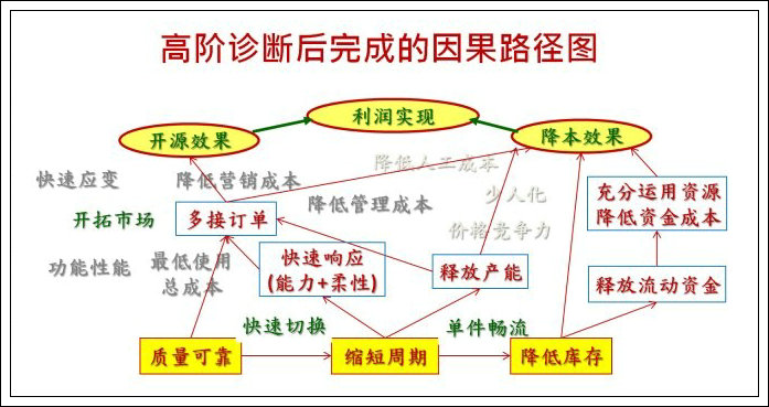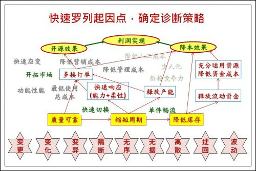 系統性的診斷固然好,但咨詢從業者通常都會被要求在短時間內提出解決方案,因為時間不足,企業高層也可能無法接受訪談,所以在這種情況下,我們通常會直接假設企業目的就是賺錢,然后用TOC的概念直接切入觀察:到底是什么因素制約了企業的獲利能力?是開源能力還是節流能力?如果是開源能力不足,再探討制約開源能力的因素又是什么?不管是產品力、服務組合提供能力、市場開拓能力…,在精益領域中都應該具有相應的解決方法(如:精益設計、精益服務…);如果是節流能力不足,那精益的工具方法的完備性就更不用說了,如此探索下去,直到完成上圖所示的因果清單,如果時間允許,最好收集數據與高層進行確認,再往下,就可以把關鍵的、已知的因果邏輯關系串聯起來(如下圖),這張高階的因果圖是說服企業領導的關鍵工具,同時也是項目組將來現場改善項目完成,將改善成果導向〝兌現利潤〞的〝兌現路線圖〞。