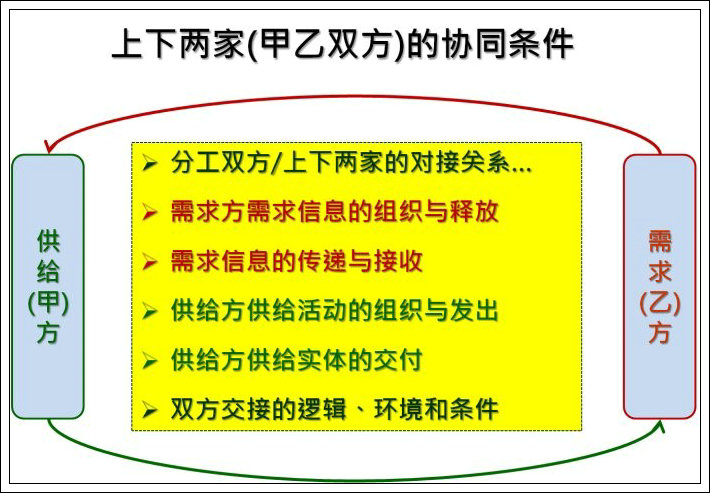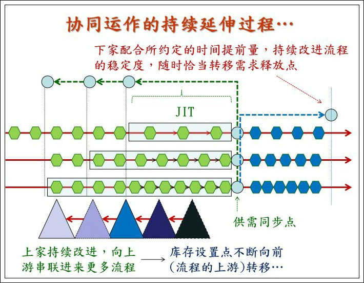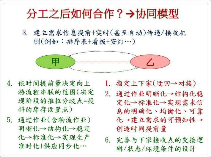 協同模型看似簡單,但是可以應用在任何〝有分工但尚無法合并集結〞的地方,這包括工段、車間、部門、企業之間的協同,甚至括及整條供應鏈也都是一樣的道理。這主要就是靠著這么一個簡單的協同原理不斷向流程的上下游延伸應用而已(參見上圖)。