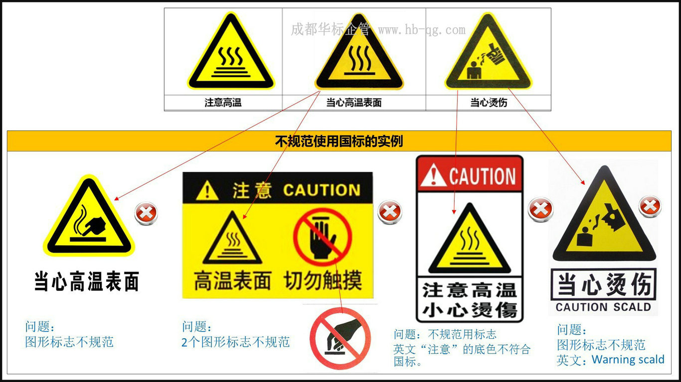 筆者現對很多企業如何正確使用“當心燙傷、注意高溫、當心高溫表面”的安全標志,以圖示舉例如下,以供企業人士參考。