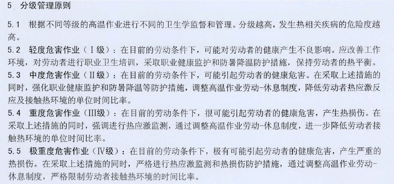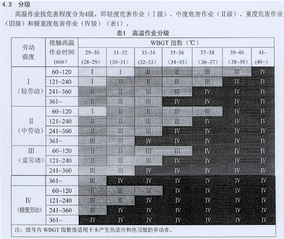 注意環境溫度高溫的標志“注意高溫”,應用標志依據的標準是GBZ/T229.3-2010 《工作場所職業病危害作業分級 第三部分 高溫》,關鍵內容截圖如下: