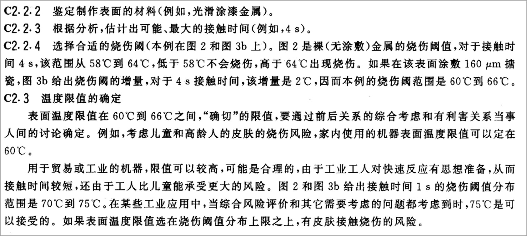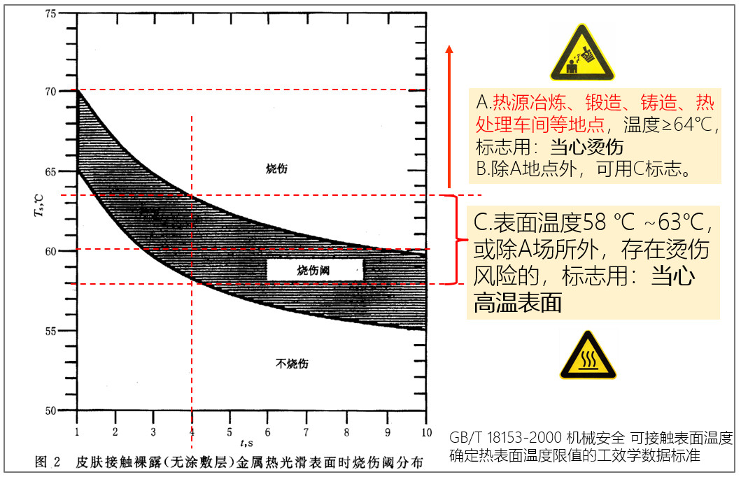 “當心高溫表面”、“當心燙傷”,根據接觸表面溫度區分標志依據是GB/T 18153-2000 《機械安全 可接觸表面溫度 確定熱表面溫度限值的工效學數據標準》,關鍵內容截圖如下: