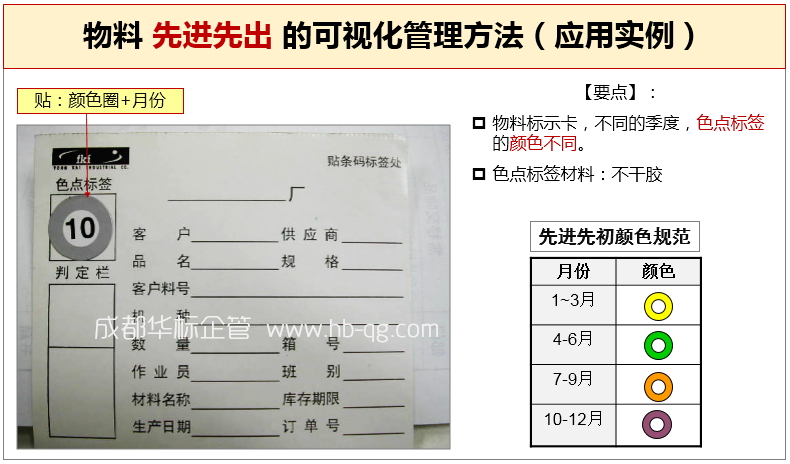 利用產(chǎn)品標(biāo)簽上不同的顏色,表示不同月份或季度,使倉管員一看顏色就知道應(yīng)先發(fā)什么物料,達(dá)到物料管理先進(jìn)先出的目的。