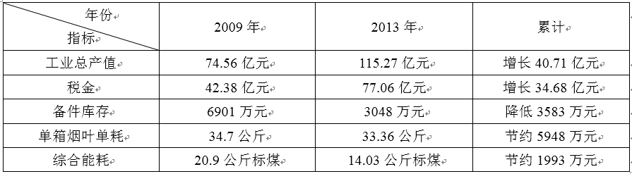 與2009年相比,2013年,在人員、設備變化不大,產量增加8.3萬箱的情況下,卷接設備運行效率由83.6%提高到96.55%,包裝設備運行效率由73.9%提高到91.35%,制絲設備故障停機率從1.13%降低到0.25%;減少生產工作日69個。備品備件資金占有率由3.38%降低到1.13%,備品備件庫存由6901萬降低到3048.04萬。單箱耗煙葉量從34.7公斤降低到34.1公斤,按照平均價格35.96元/公斤計算,累計節約費用5900余萬元;單箱卷煙綜合能耗從20.9公斤標煤降到10.9公斤標煤,企業綜合競爭實力得到全面提升。榮獲“全國設備管理創新示范基地”和“全國設備管理優秀單位”等榮譽稱號。