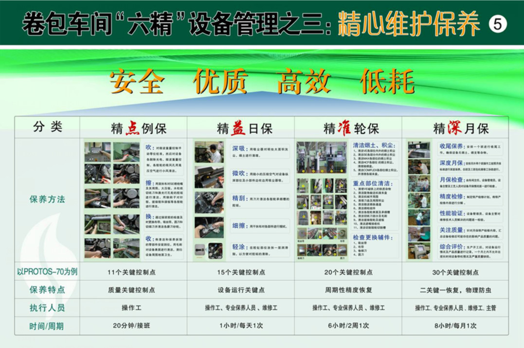 近年來,青島卷煙廠積極響應行業設備管理精益化要求,以“泰山”品牌發展為導向,按照“市場決定產品、產品決定工藝、工藝決定設備、設備決定人才、人才決定機制”的思路,在合理配置設備,突出產品風格特色基礎上,自覺運用精益管理思想、原則和工具,遵循“把復雜留給設計,把簡單留給操作”,對設備管理進行改進創新。逐步構建起以精確數據管理、精準狀態預測、精心維護保養、精算成本控制、精實績效管理、精干隊伍建設為主要內容的“六精”設備管理模式,使生產一線員工能夠“看得懂、摸得著、做得快、有規范”,為企業升級發展和“泰山”品牌提質攻堅奠定了堅實基礎。榮獲“全國設備管理創新示范基地”和“全國設備管理優秀單位”等榮譽稱號。