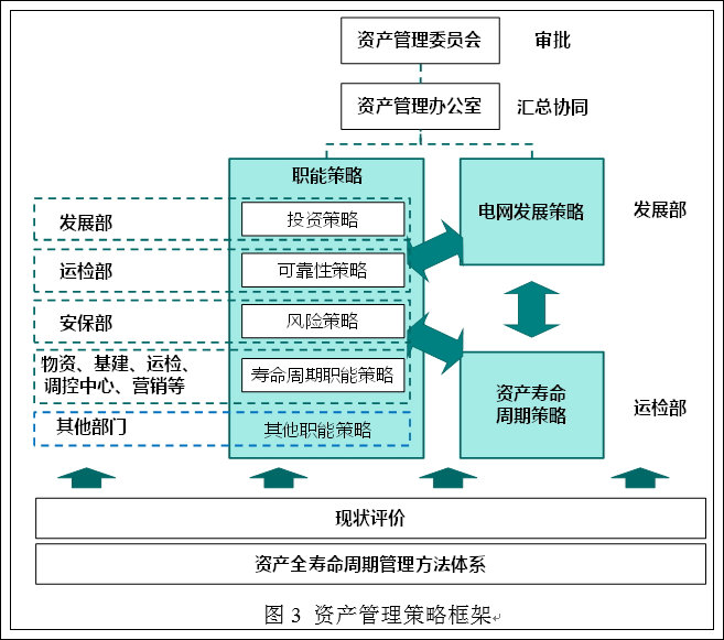三是策略。結合資產現狀評價結果,采用資產全壽命周期管理通用技術方法,制定資產管理策略。資產管理策略框架包括電網發展策略、壽命周期策略及職能策略等。其中職能策略由投資策略、風險管理策略、可靠性管理策略、物資管理策略、基建管理策略、營銷管理策略、運行管理策略、運檢(運維、檢修、搶修等)管理策略、退役報廢管理策略、報廢處置策略等。