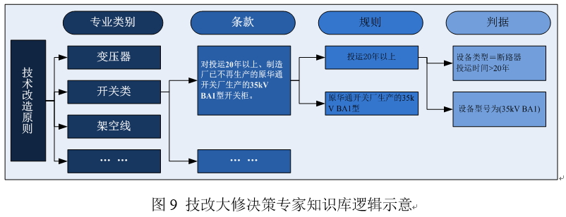 首先是開展項目級評估,對各類設備設定重要等級,通過對項目涉及到的改造對象進行評估,綜合計算項目建設必要性得分,為項目立項提供輔助決策依據;對設備評分時,從生產管理系統等外圍業務系統獲取設備的關鍵屬性(例如:故障缺陷情況、資產壽命信息等),保證項目評估的客觀性和準確性。其次是建立專家知識庫;專家知識庫建立在技術改造項目管理規范和生產管理經驗的基礎上,是對各類標準、文件的規格化總結,將可以量化的指標盡可能的量化;技術改造原則文件將各專業設備分為若干大類:架空線路、電纜線路、變電一次設備、繼電保護及安全自動裝置、直流電源、防誤裝置、在線監測裝置、自動化設備、通信設備、公用設施以及其它類;在各大專業類別中分別對各種改造情況加以總結歸納,稱為條款; 在條款之下,分解出具體的業務規則,每條業務規則又由若干條判據組成。