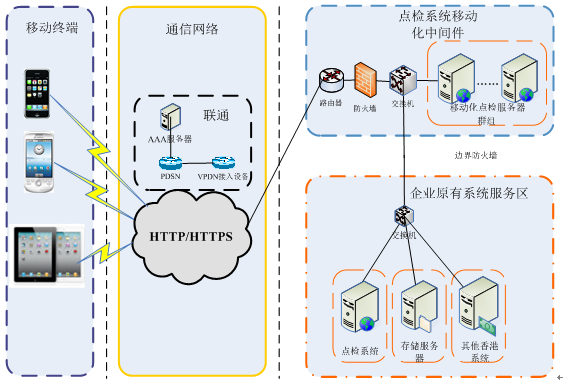 (一)利用中國聯通高速WCDMA 3G無線網絡,結合智能終端智能化功能及自帶GPS定位功能,實現設備點檢工作的移動化辦公,提高工作效率,大大減輕點檢人員操作難度。在原有的設備管理信息系統服務器前部署聯通點檢系統移動化中間件,中間件用先進的頁面數據解析抓取技術,與適配系統業務邏輯脫離,在完全不改動企業現有應用系統的情況下,就能將現有系統的數據轉變為手機客戶端可以識別的終端數據,大大減少了開發成本,無需過多學習系統業務流程,實現業務系統的快速、安全移動化。同時也可以通過系統提供的接口,將系統提供的數據展現到手機終端上。