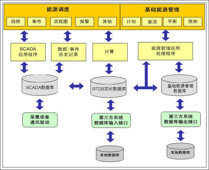 能源中心軟件主要包括操作系統軟件、數據采集軟件、監視調度軟件、實時數據庫軟件、關系數據庫軟件、管理平臺軟件、與現有信息化系統的接口軟件等。