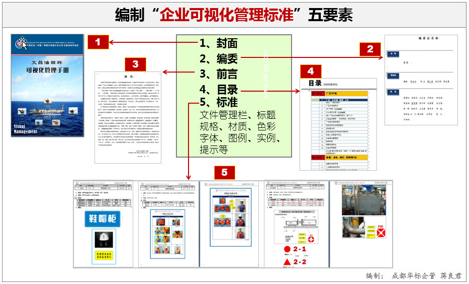 將前面的設計稿和安裝后的圖片,梳理編制,形成安全可視化標準,安全可視化標準應包括:文件管理欄、標題、規格、材質、色彩、字體、圖例、實例等,見下圖。將制造好的安全可視化,根據內容,對相應的崗位培訓到位,讓人員明白、熟悉安全可視化的目的和用途,并強調哪些是必須遵守的。