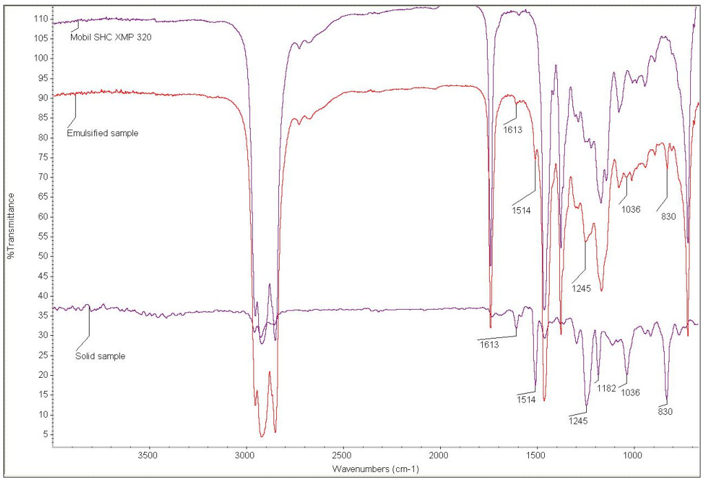 廣研檢測(cè)技術(shù)工程師對(duì)樣品外觀進(jìn)行了仔細(xì)觀察, 發(fā)現(xiàn)該油泥黏性非常高, 與普通的乳化油泥并不相同, 初步判斷其屬于外來(lái)污染, 建議采用紅外光譜判斷其成分。