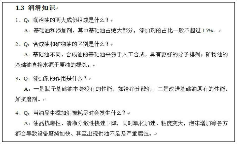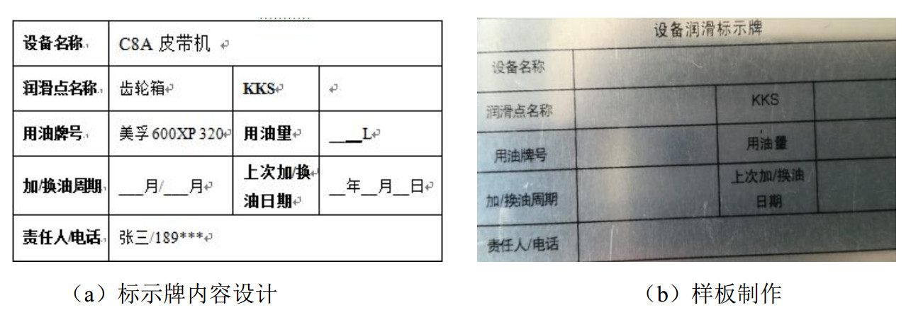 設(shè)備潤(rùn)滑臺(tái)賬包含設(shè)備潤(rùn)滑信息表、 各類系統(tǒng)加換油操作規(guī)程、 潤(rùn)滑知識(shí)和油液檢測(cè)常見(jiàn)異常處理措施四個(gè)方面的內(nèi)容, 這四部分內(nèi)容基本囊括了現(xiàn)場(chǎng)開(kāi)展設(shè)備潤(rùn)滑的各個(gè)方面, 是一本指導(dǎo)現(xiàn)場(chǎng)開(kāi)展設(shè)備潤(rùn)滑的實(shí)用手冊(cè)。 另一方面, 通過(guò)后續(xù)設(shè)備潤(rùn)滑點(diǎn)可視化標(biāo)示牌的推廣, 可以很大程度避免現(xiàn)場(chǎng)加錯(cuò)油情況的發(fā)生, 為設(shè)備加對(duì)油品提供雙重保障。
