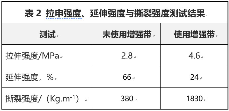 在管道上涂層終結的兩端以及法蘭面圓周處使用增強帶,可以在檢測時的剝離及密封過程中增加聚合物材料在關鍵受力區域的強度,使該系統具有更優越的彈性及強度,實驗結果見表2所列。