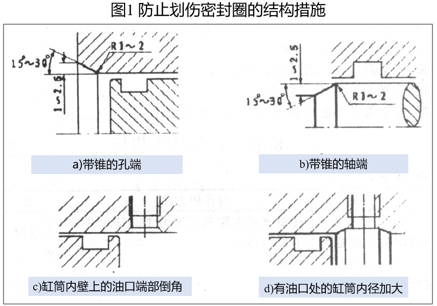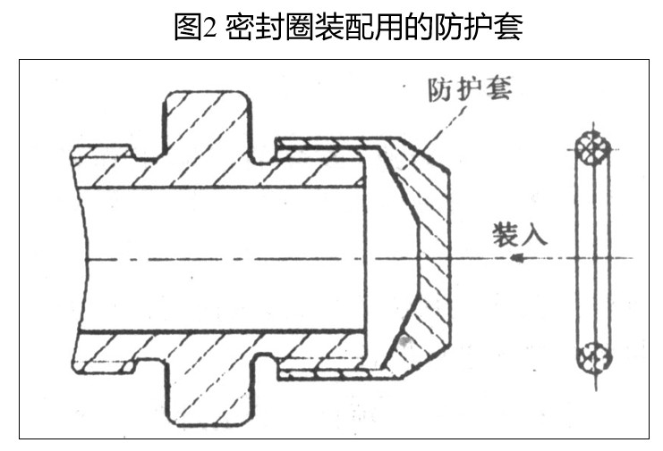 2.6.5 為防止裝配時劃傷密封圈,在孔和軸的端部要有導引錐;若在缸筒內壁上有進油口時,油口處要倒角或將油口部位的直徑加大,且應設有過渡錐(見圖1),對帶有螺紋或花鍵的軸頭,裝配密封圈時要用保護套(見圖2)。