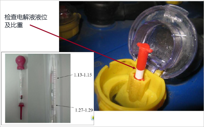 4.完全充電結(jié)束后,應(yīng)檢查電解液的液面高度,如液位低于允許高度(低于加水塞),應(yīng)補(bǔ)充符合標(biāo)準(zhǔn)的蒸餾水(加至加水塞最低位向上1-2厘米),但不可加入任何酸液;如電解液過多,須抽出至規(guī)定的高度。