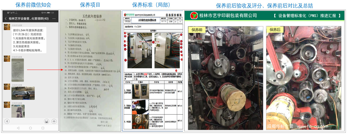 1)在實(shí)施前,可以內(nèi)部微信群內(nèi)告知何時(shí)將保養(yǎng)什么設(shè)備的什么內(nèi)容,并請(qǐng)保養(yǎng)驗(yàn)收人安排時(shí)間驗(yàn)收。保養(yǎng)過程中或保養(yǎng)后,可拍保養(yǎng)的圖片上傳微信群。如:桂林市藝宇印刷包裝有限公司 的實(shí)例: