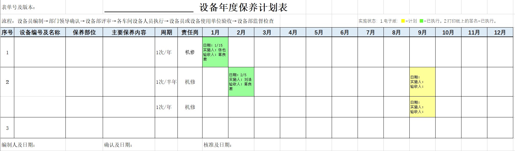 注4:年度設(shè)備保養(yǎng)計(jì)劃表,宜包括的內(nèi)容:序號(hào)、設(shè)備編號(hào)、設(shè)備名稱、保養(yǎng)(或檢修)部位、主要保養(yǎng)/檢修內(nèi)容、周期、責(zé)任崗、計(jì)劃保養(yǎng)月份1月~12月(每臺(tái)設(shè)備對(duì)應(yīng)的計(jì)劃月份單元格內(nèi)有用于實(shí)施后的簽名:日期、執(zhí)行人、驗(yàn)收人)、制表人及日期、審核人及日期,計(jì)劃與實(shí)施的單元格顏色區(qū)分(計(jì)劃=黃色,)已執(zhí)行=綠色)、表格編號(hào)及版本識(shí)別號(hào)。