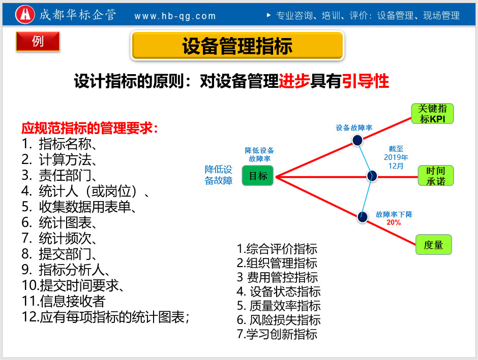 為滿足市場或客戶對產品或服務要求,從設備管理角度,需在過程或實現目標的相關職能建立適宜的設備目標或指標,作為設備管理過程或結果(績效)的評價。