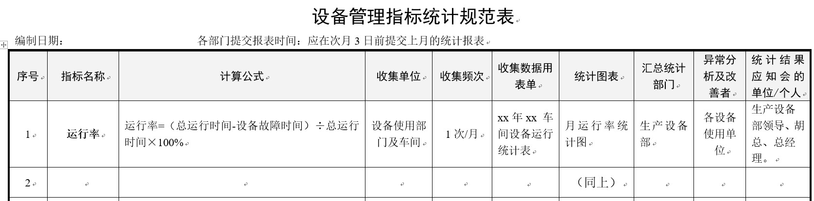注1:設備綜合評價指標類,如:設備綜合效率(OEE)、可開動率、設備利用率、設備完好率、儀表完好率、連續產品作業(生產)時間、停產(或停機)時間、停產(或停機)次數、可燃或有毒氣體檢測報警儀安裝率、泄漏率、帶壓堵漏次數、管道通球率、管道腐蝕等級比率、點檢準確率(失誤率)、故障診斷準確率,正常/異常檢出率、設備故障率、設備MTBF(平均故障間隔期)、設備MTTR(平均修理時間)、設備故障停產損失費用率、設備事故次數、設備事故時間、設備能耗指標、設備能力指數、設備新度系數、設備固定資產利用率、特種設備評價得分、設備檢查成績、設備管理體系星級評價等級或得分率等。