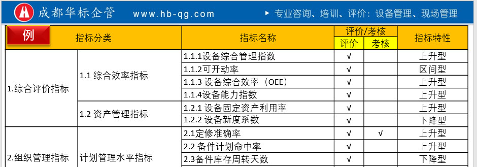 設備管理者與相關部門在設定設備管理目標(或指標)時,應注意區分評價指標(或觀察性指標)與考核指標,追求合理性(多數人認為合理就是合理的)。指標宜少不宜多。注:觀察性指標,不作為考核,作為引導性、參考性的指標。