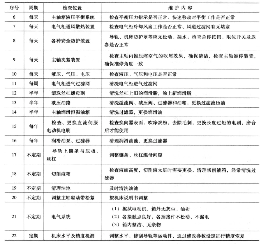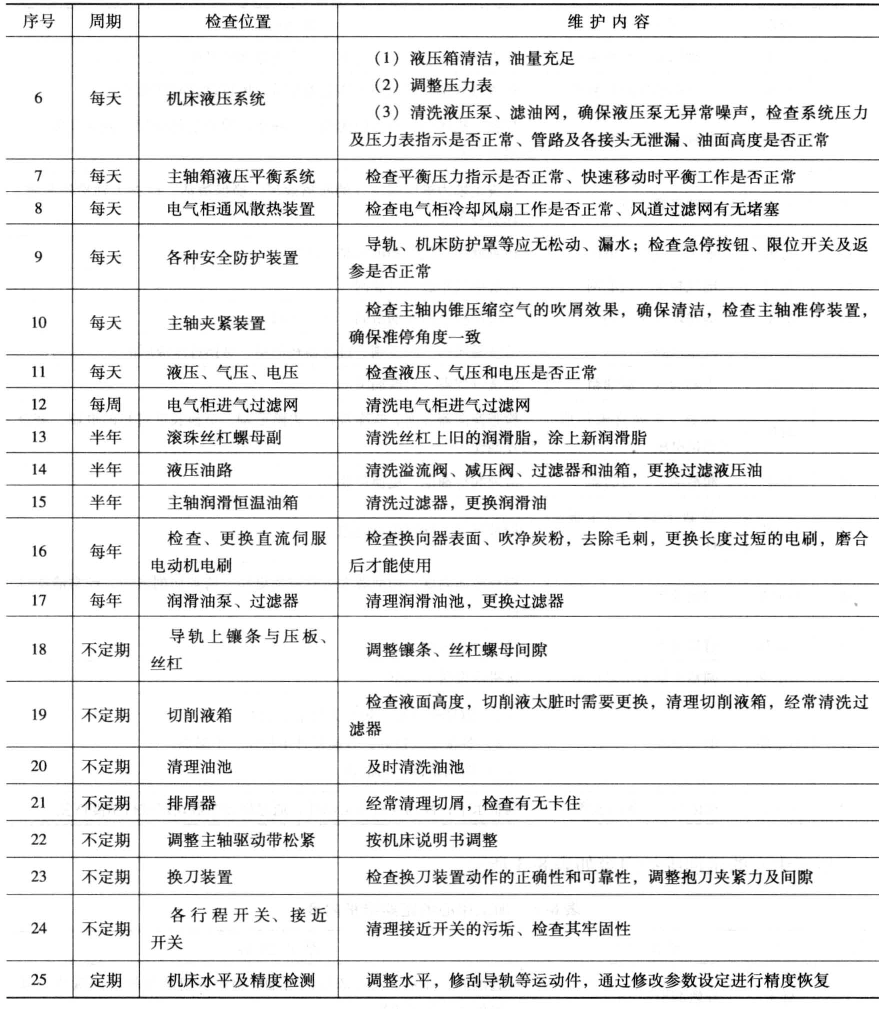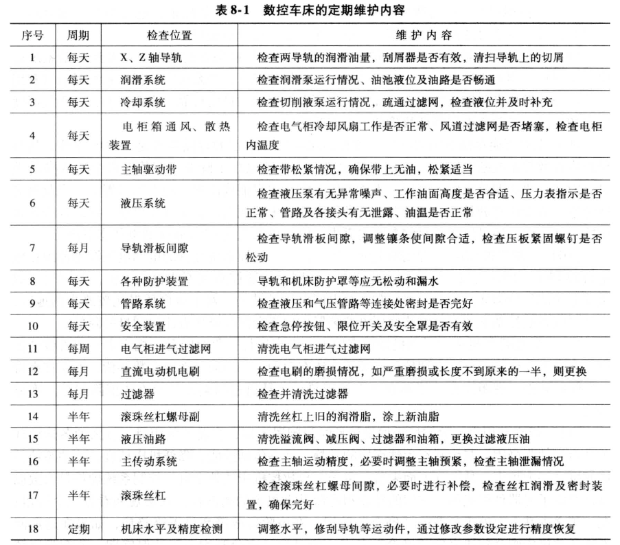 由于數控機床種類繁多,各類數控機床因其功能、結構及系統的不同,各具有不同的特性,其維護、保養的內容和要求也各不相同,應根據機床的種類、型號及實際使用情況,并參照機床使用說明書要求,制定和建立必要的定期、定級保養制度。數控車床的定期維護內容如下表: