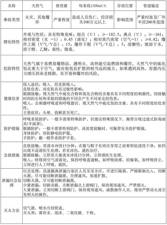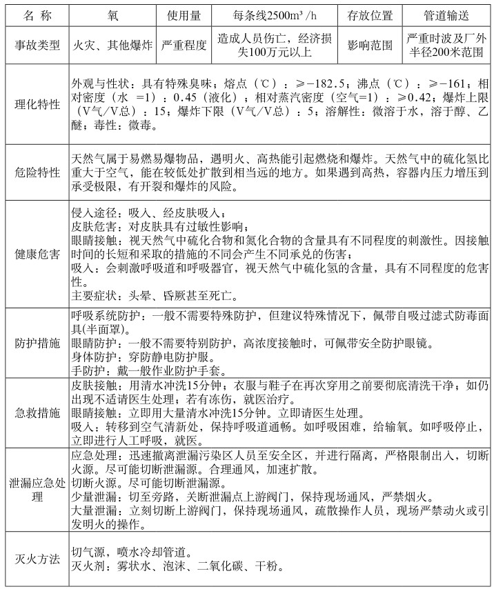根據《危險化學品名錄(2015版)》,分廠主要涉及危險化學品:天然氣、氧,危險、有害特性見下表: