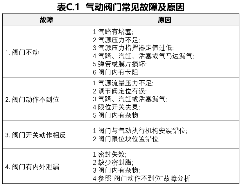 c)氣動閥門常見故障及原因分析參見附錄C。