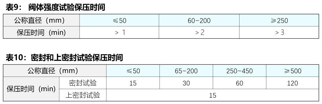 a)閥體強度試驗保壓時間應符合表9的要求,閥體(包括填料函和中法蘭處)不得有滲漏或結