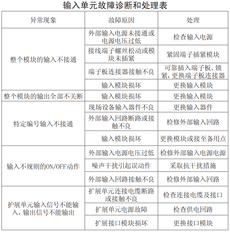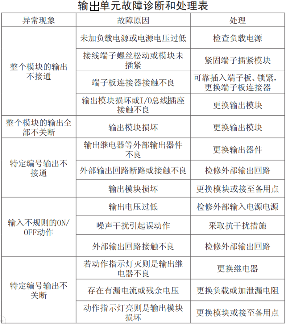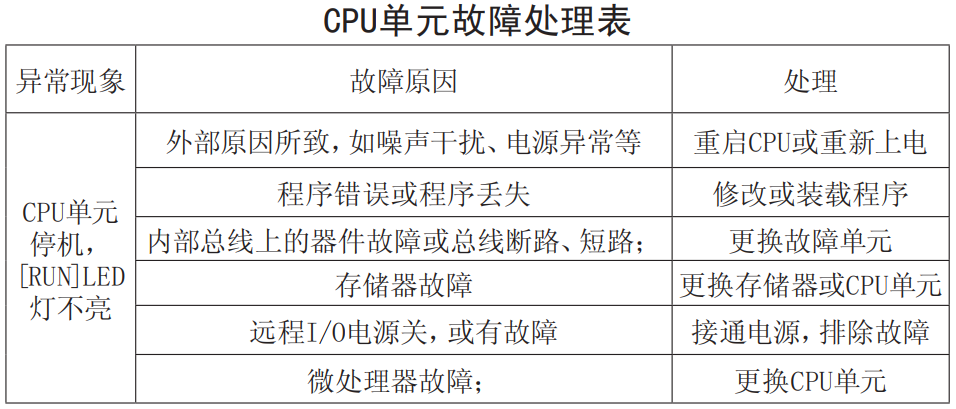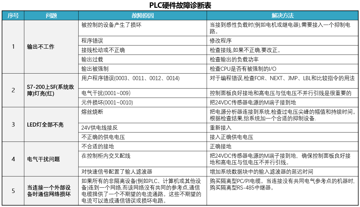 PLC是一種可靠性、穩定性極高的控制器。只要按照其技術規范安裝和使用,出現故障的概率極低。但是,一旦出現了故障,一定要按表“PLC硬件故障診斷表”所示步驟進行檢查、處理。特別是檢查由于外部設備故障造成的損壞,一定要查清故障原因,待故障排除以后再試運行。