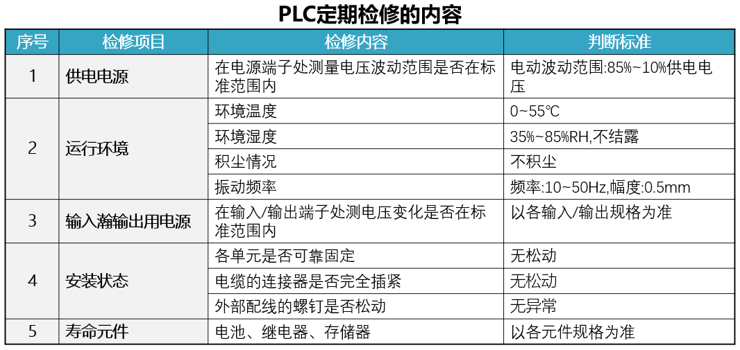 可編程控制器的主要構成元器件是以半導體器件為主體,考慮到環境的影響,隨著使用時間的增長,元器件總是要老化的。因此定期檢修與做好日常維護是非常必要的。需要有一支具有一定技術水平、熟悉設備情況、掌握設備工作原理的檢修隊伍,做好對設備的日常維修。對檢修工作要制定一個制度,按期執行,保證設備運行狀況最優。每臺PLC都有確定的檢修時間,一般以每6個月~1年檢修一次為宜。當外部環境條件較差時,可以根據情況把檢修間隔縮短。PLC定期檢修的內容如表“PLC定期檢修的內容”所示。