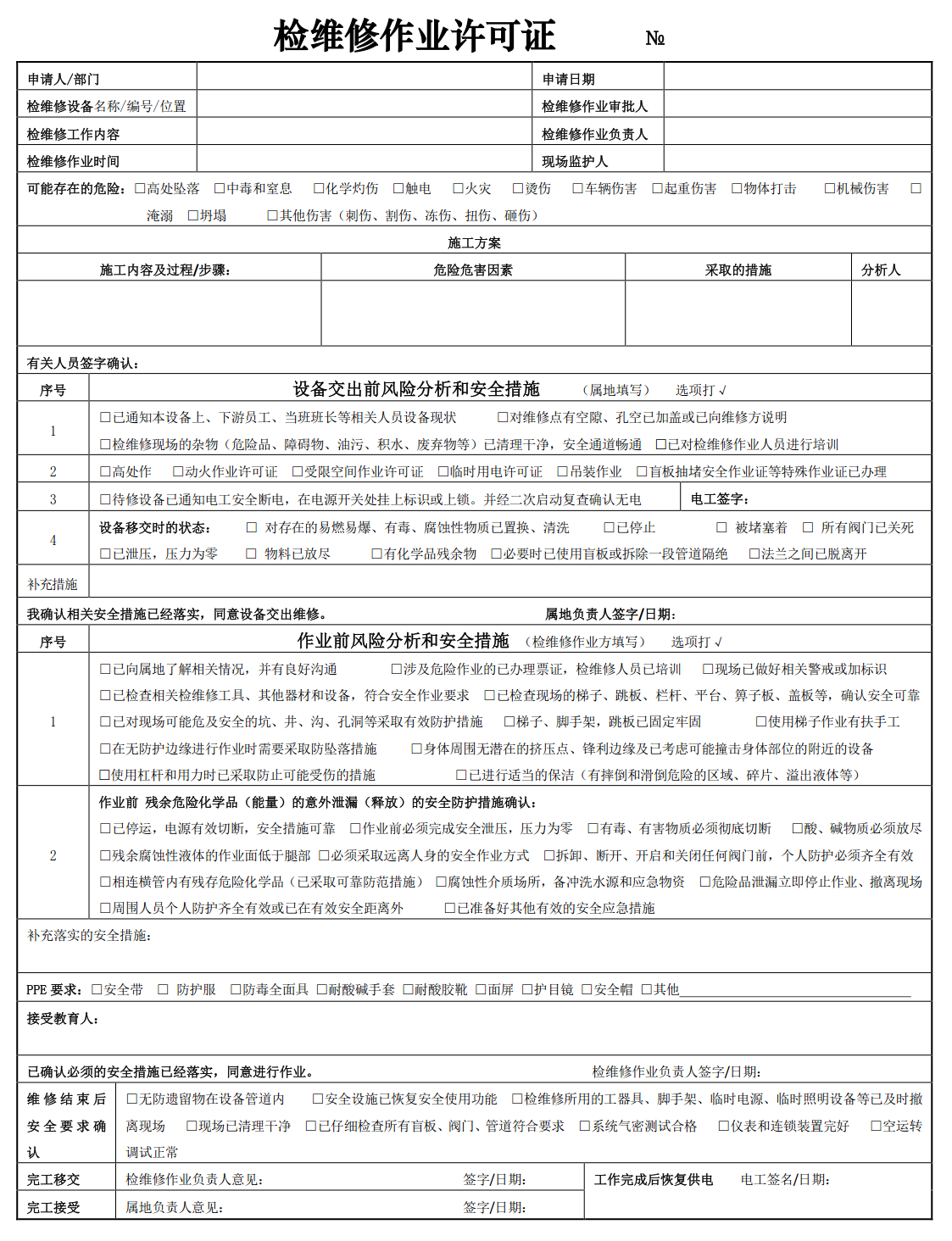 7.3 一張《設(shè)備檢維修作業(yè)許可證》只限一處檢維修作業(yè),實(shí)行一處(一個(gè)地點(diǎn))、一證(《檢維修作業(yè)許可證》),不能用一張《設(shè)備檢維修作業(yè)許可證》進(jìn)行多處作業(yè)。