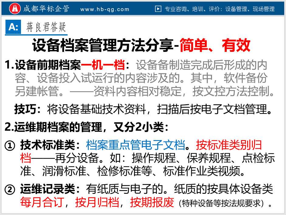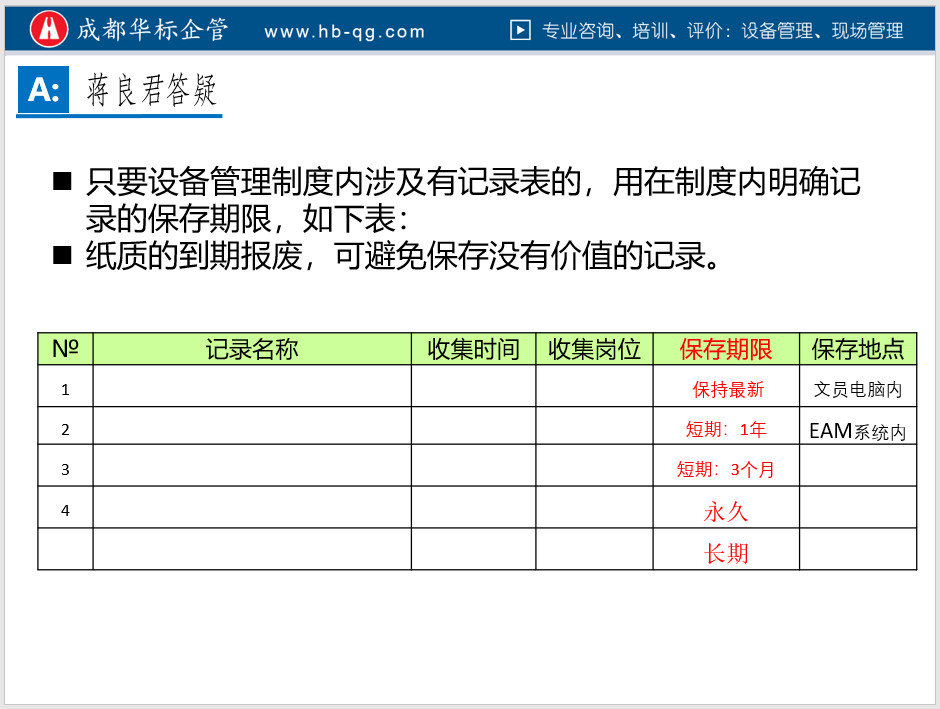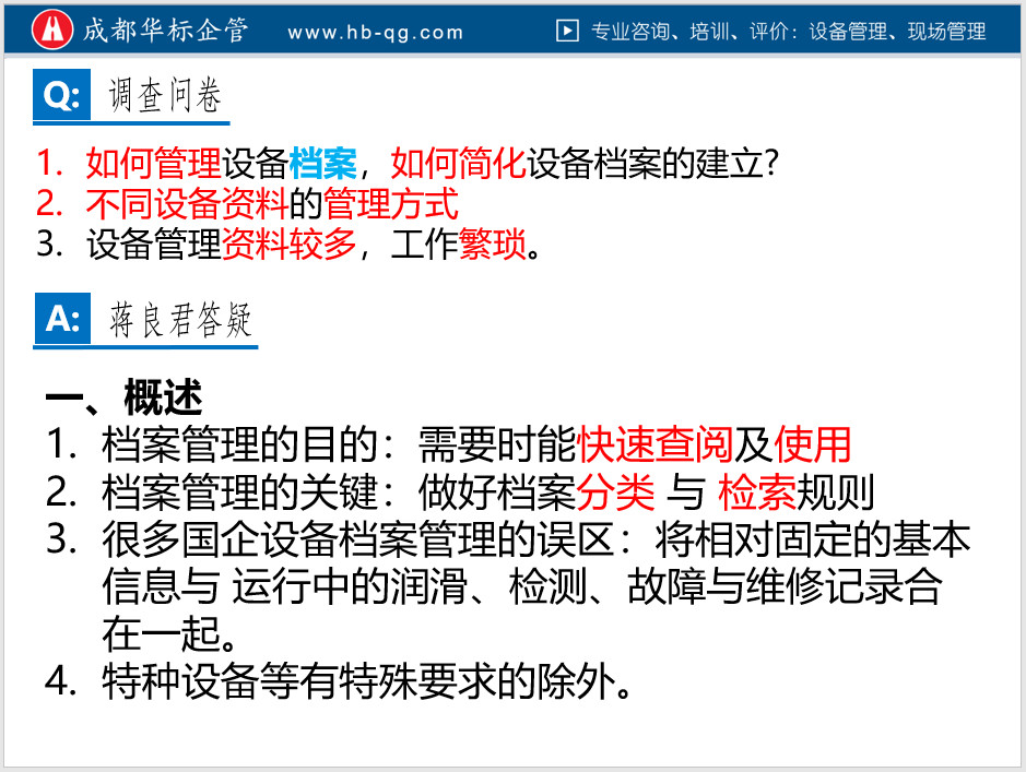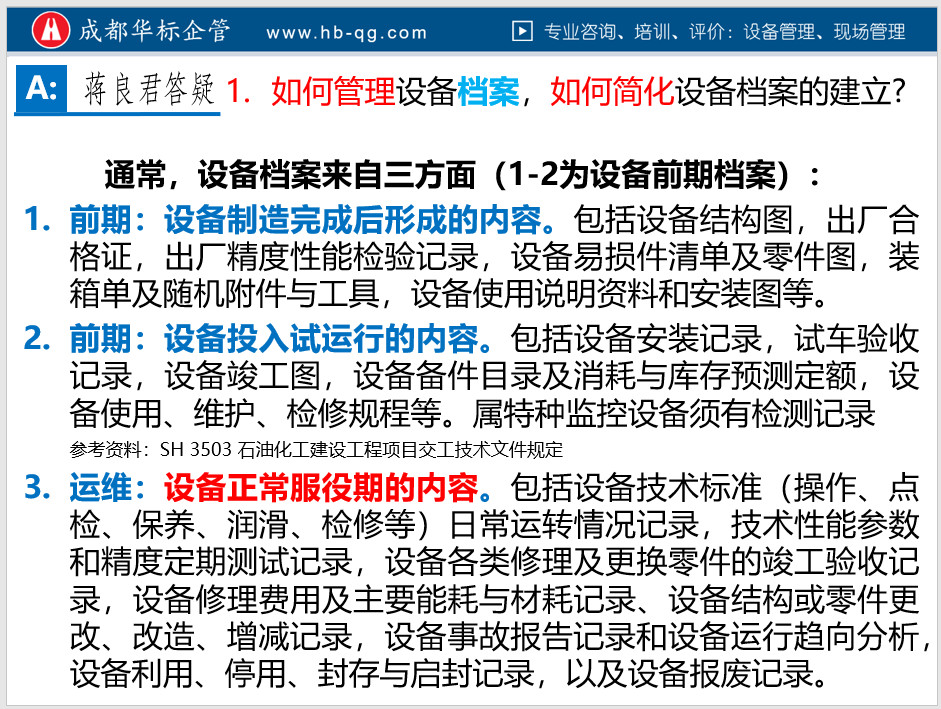 3.以下是蔣老師在企業培訓時,有關設備檔案管理的答疑截圖,僅供參考: