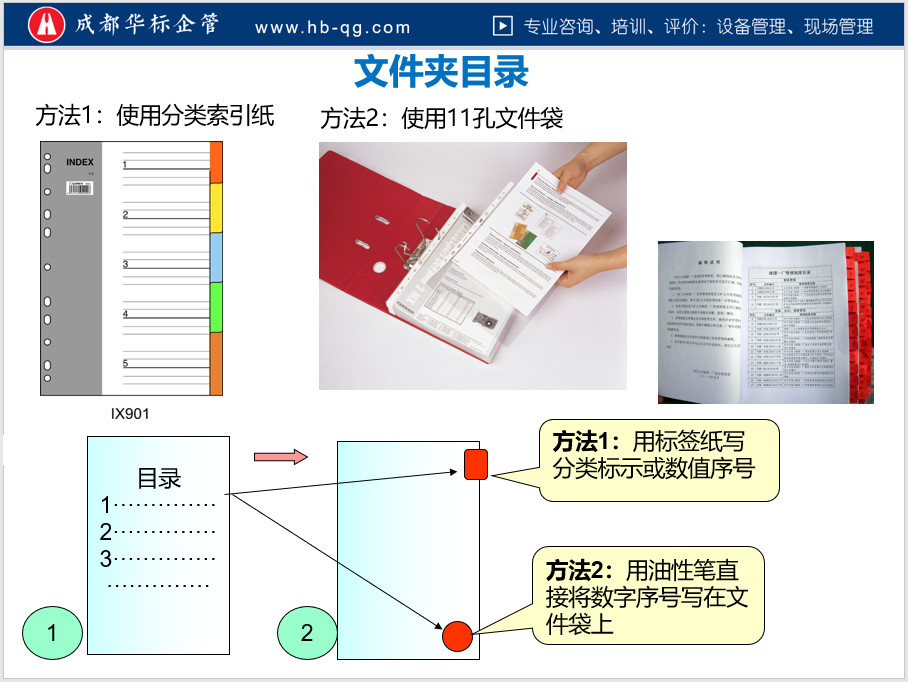 3.1 文件夾。建議使用可放11孔袋(透明袋)的文件夾,避免用檔案室用的檔案盒。根據需要,可在每個文件夾的首頁,編制目錄,目錄的序號,對應11孔袋右下角的編號(數字序號)。
