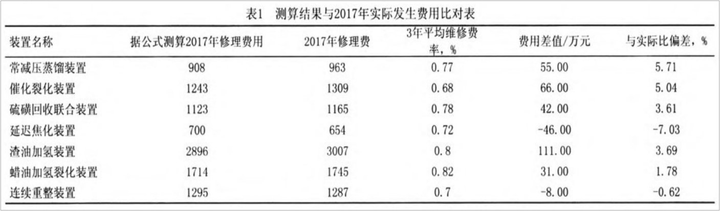 4、根據(jù)2017年已發(fā)生檢維修費(fèi)用測(cè)算預(yù)算公式準(zhǔn)確性根據(jù)公式測(cè)算結(jié)果與2017年實(shí)際發(fā)生費(fèi)用比對(duì),單位 萬(wàn)元(抽測(cè)幾個(gè)裝置費(fèi)用結(jié)果),詳見(jiàn)表1。
