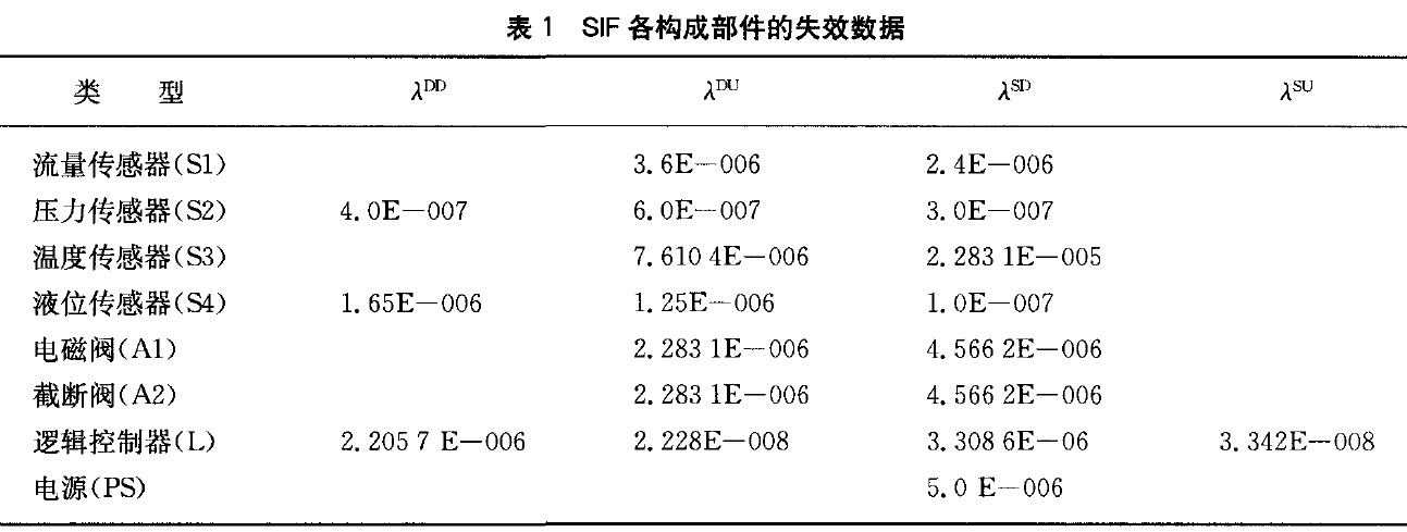 該SIF設計為失電使能(停電時,執(zhí)行機構置于安全狀態(tài),即事故安全型),且各傳感器檢測回路和執(zhí)行機構回路具有在線診斷能力。由于系統(tǒng)具有旁路設置和冗余配置,當在線檢測出故障后,可在線維護與更換,檢修時間平均為8 h。SIS的整體測試間隔與設備大修周期同步,為3年。該SIF的SIL等級需求為SIL2,其各組成部分的失效數據見表1所列。