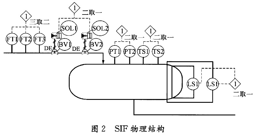 針對SIS存在的主要問題,筆者以圖2~3所示SIF為例,探討采用馬爾可夫模型進行SIF可用性分析,考核驗證SIF、的SIL和誤停車率指標(MTTFS和PFS avg )。依據分析結果,提出合理化建議,以提高SIS系統(tǒng)的投用率,保障對生產裝置的防護能力。